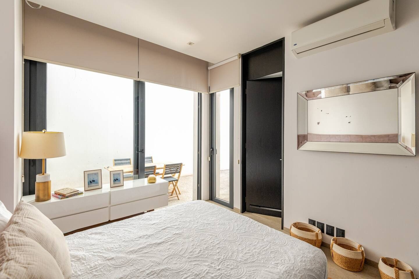 El diseño moderno y los muebles de estilo contemporáneo crean un ambiente acogedor y armonioso. Un ventanal amplio con salida al balcón baña el espacio de luz natural y ofrece una vista encantadora del entorno urbano, conectándote visualmente con el ritmo local sin sacrificar la privacidad ni la tranquilidad.