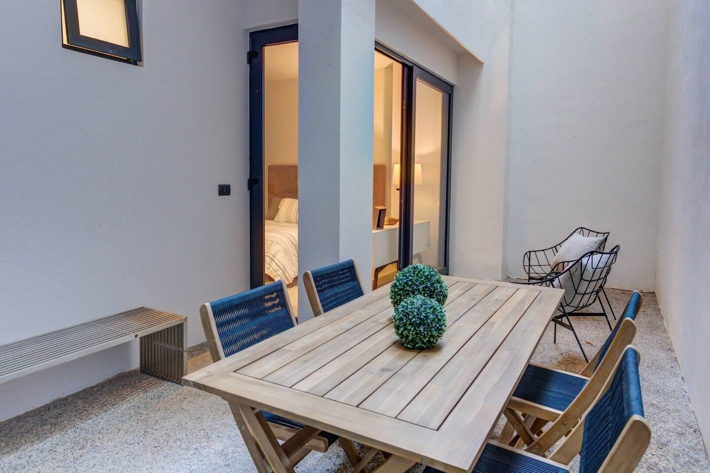 Uno de sus espacios más especiales es la terraza interior completamente privada, está rodeada por muros altos que crean un ambiente íntimo y relajado. Amueblada con una mesa de madera y sillas contemporáneas, este rincón es perfecto para una comida al aire libre, una charla por la tarde o simplemente disfrutar del aire fresco con una bebida en mano.
