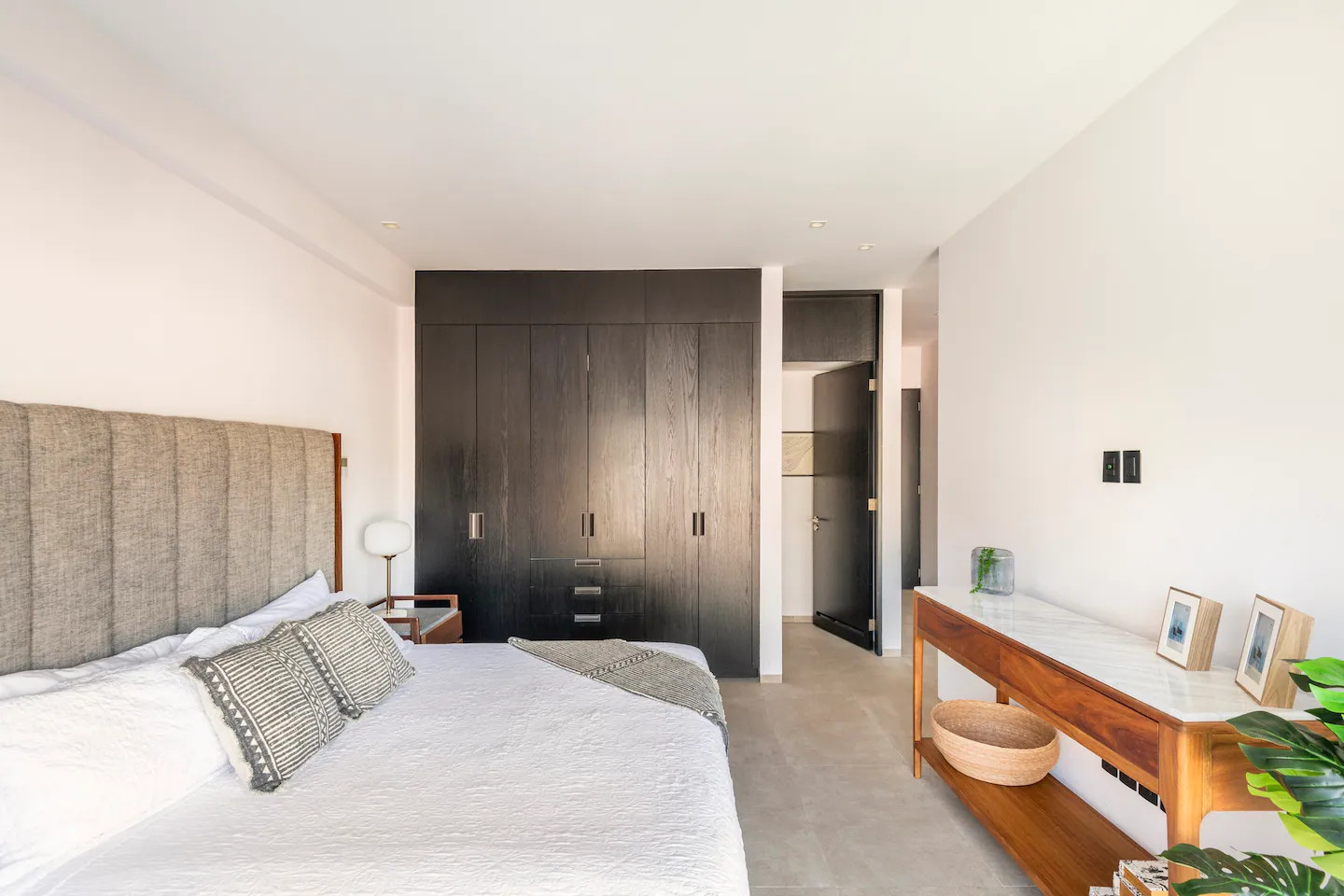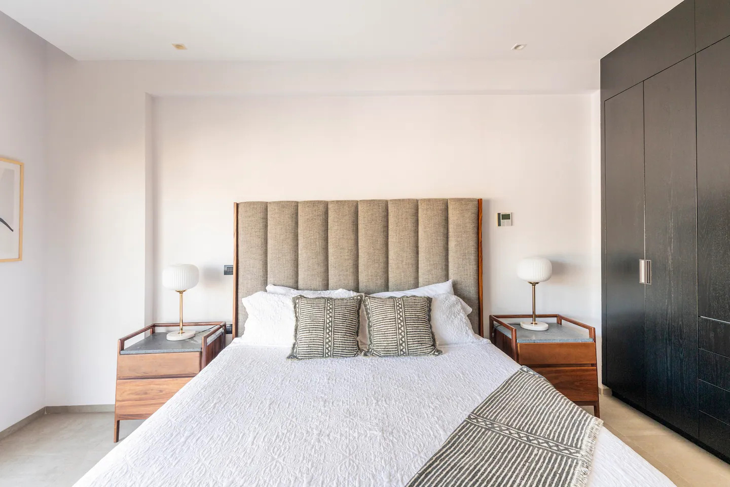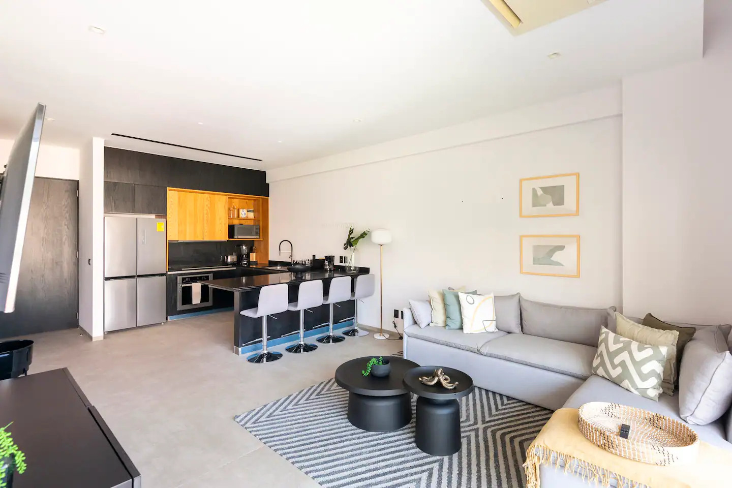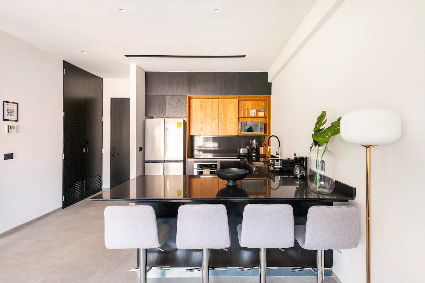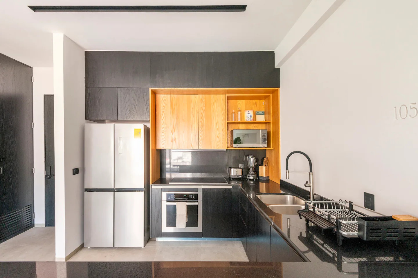 El estudio cuenta con una cama King size, área de descanso con smart TV, cocina integral totalmente equipada, baño amplio con acabados modernos y aire acondicionado para mayor comodidad. La decoración combina tonos neutros y detalles elegantes que crean una atmósfera relajante, ideal para descansar después de explorar la ciudad.