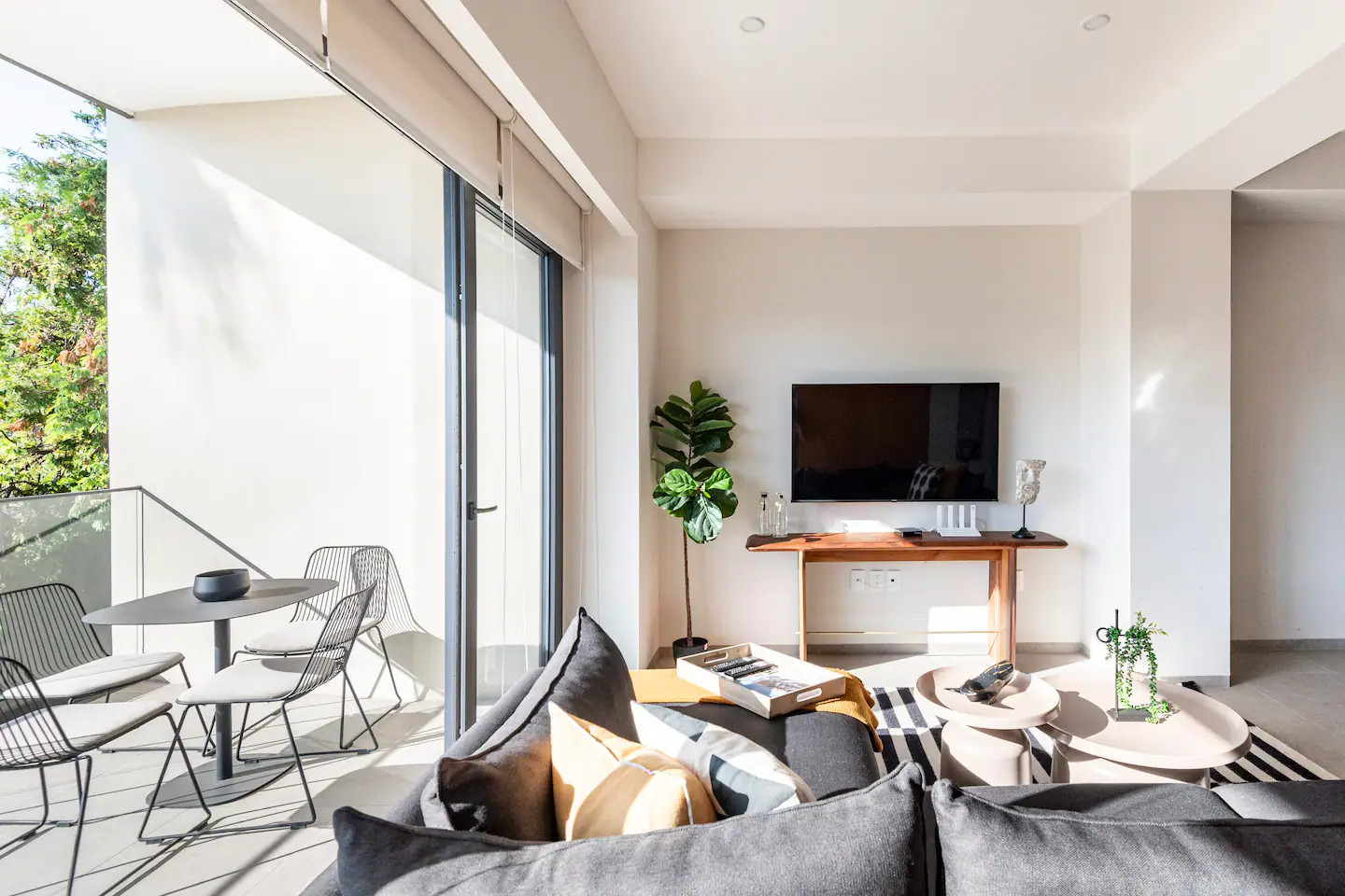 This 202 apartment features a fully equipped kitchen, dining area, comfortable living room, laundry room, and two full bathrooms. One of them is en-suite to the master bedroom, which includes a king-size bed. The second bedroom offers two double beds and a spacious closet.