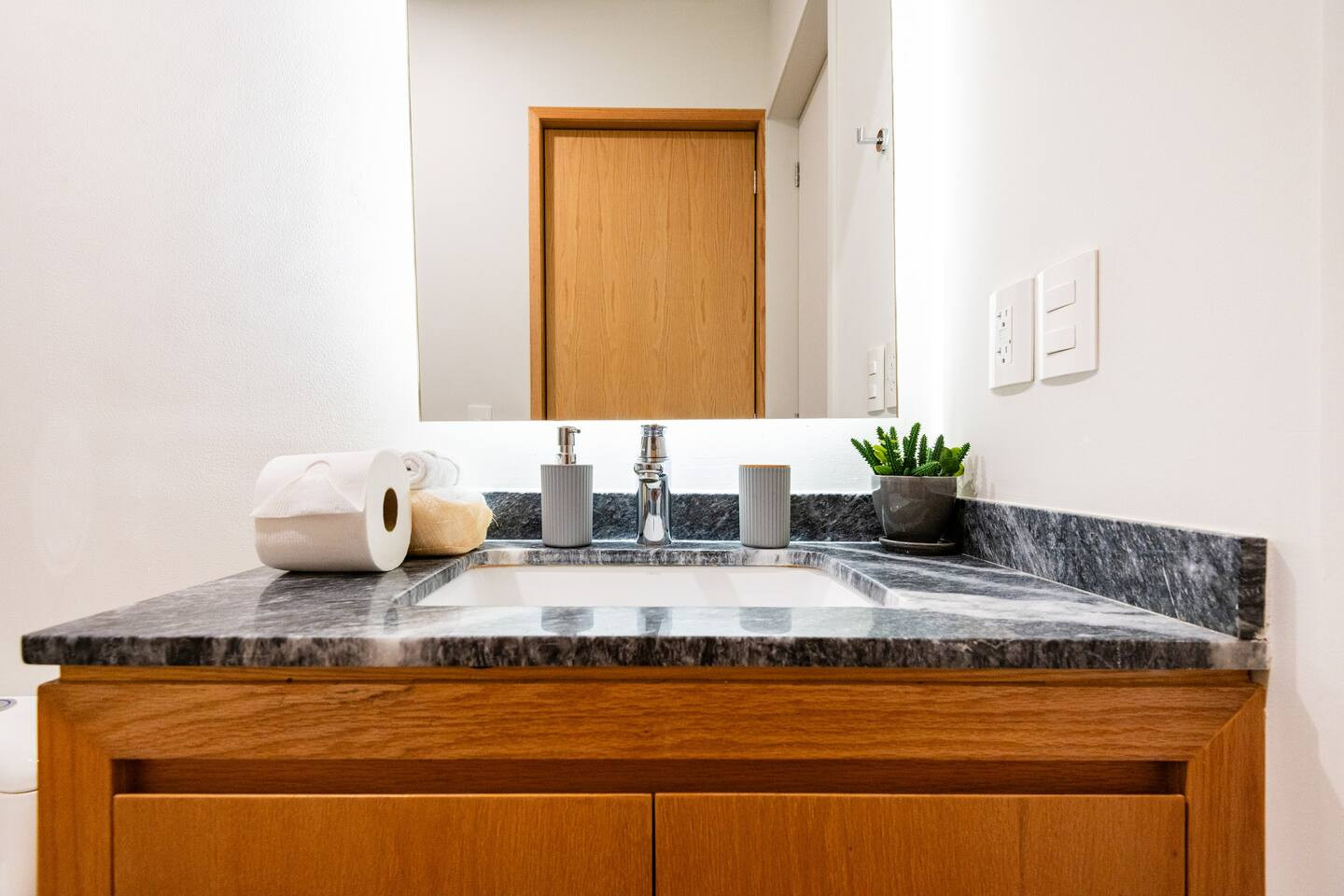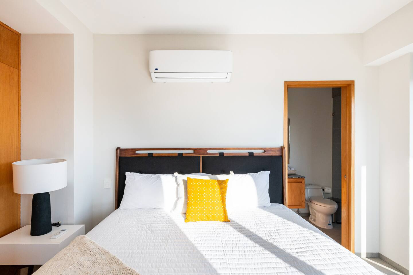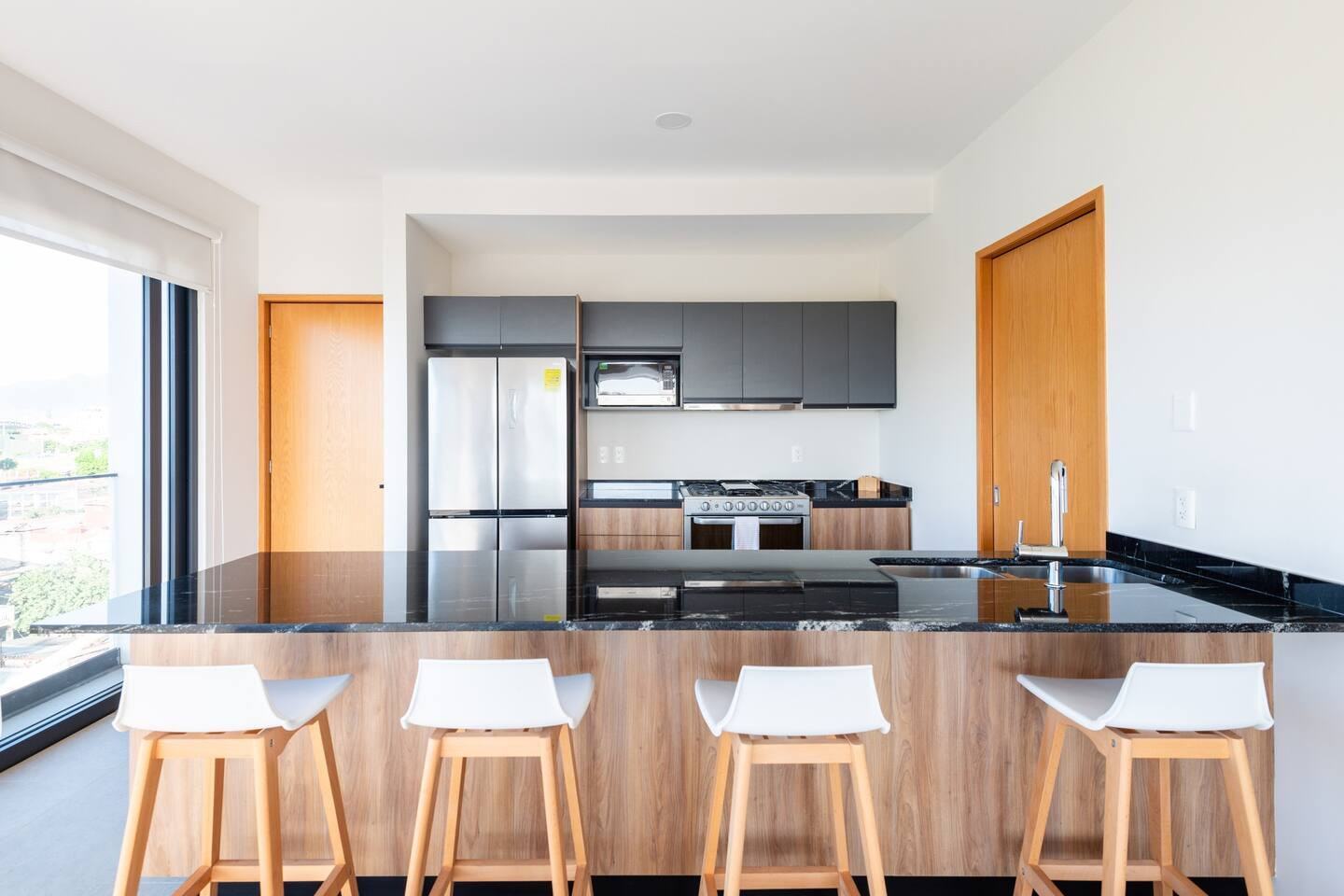 This 201 apartment features a fully equipped kitchen, dining area, living room, laundry room, and two full bathrooms. One of them is located inside the master bedroom, which includes a king-size bed. The second bedroom also has a king-size bed and a spacious closet.